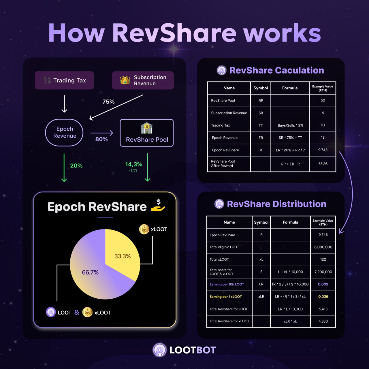 `Epoch Revshare` is made up of **20%** from `Epoch Revenue` and **14.3%** from the `Revshare Pool`. As LootBot continues to generate revenues, the reward pool keeps building up and yield $LOOT and $xLOOT holders a stable and consistent share of the revenue.