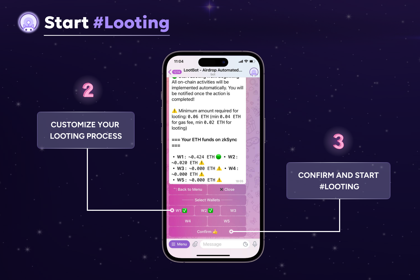 *Please always maintain 0.04 ETH on your farming chain to cover gas fee. For more information, go to* [faq](https://docs.lootbot.xyz/lootbot/telegram-bot/about-telegram-bot/faq "mention")